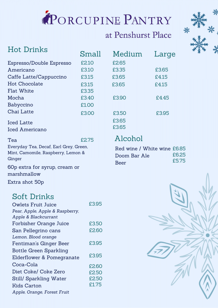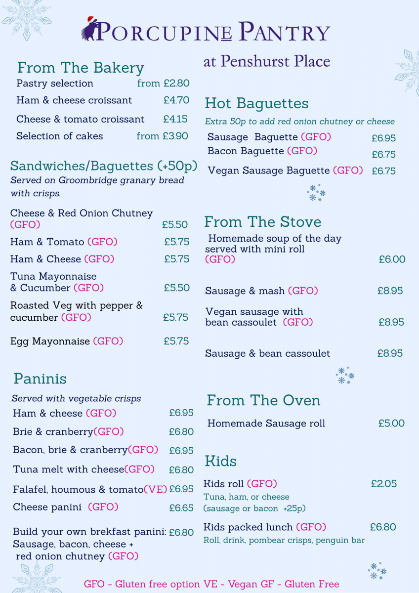 Sitting in our converted and now extended barn, the Porcupine Pantry Cafe is an ideal hub for walkers, cyclists and visitors to the beautiful village of Penshurst to enjoy a selection of locally made cakes, alongside hot and cold drinks, pastries, sandwiches, baguettes, hot lunch options, salads and snacks.